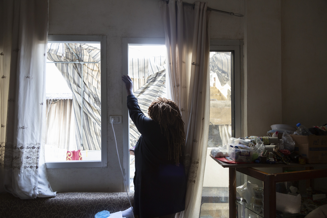 تقف ديانا خلف الستائر التي تفصل غرفة نومها عن غرفة المعيشة، حيث تنام النساء المهاجرات اللواتي تستضيفهنّ منذ اندلاع الحرب.