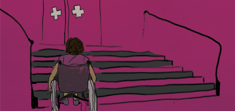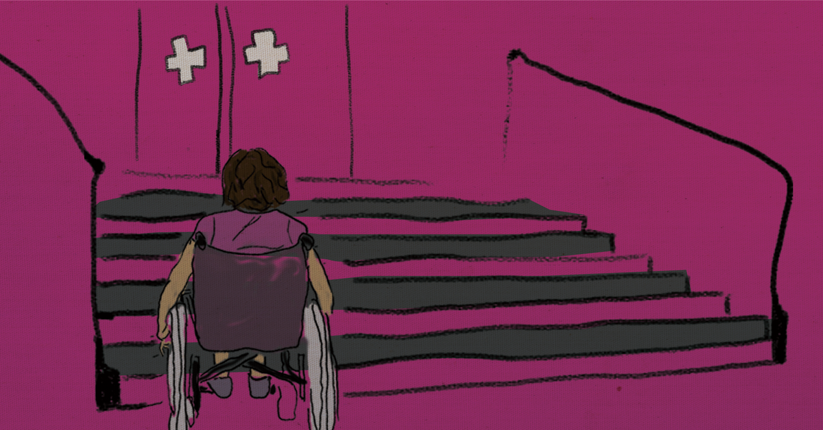 في غرفة انتظار صغيرة ذات إضاءةٍ بيضاء باردة، تحاول امرأةٌ على كرسي متحرّك أن تناور بين بابٍ ضيّق وسرير فحصٍ مرتفع. تسألها الممرّضة بنبرة روتينية: "معِك حدا يوقّع؟" ثمّ تهمس بسؤالٍ آخر: "هل أنتِ أصلًا بحاجة لوسائل منع حمل؟".
