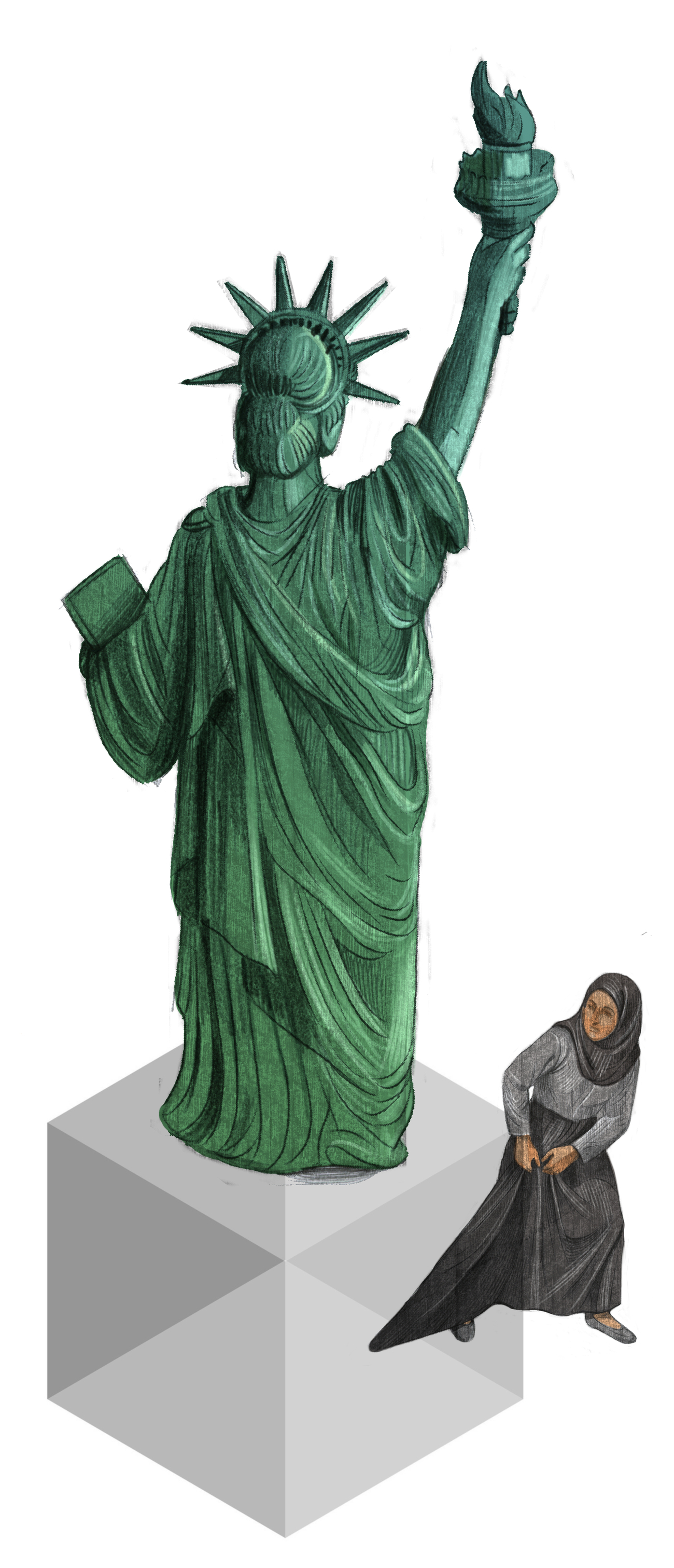 لكن في الحقيقة، لم يكن الحجاب وحده ما أثار الهلع، بل الجسد الأنثوي المحجوب الذي أعلن حقّه في الظهور ضمن الفضاء العام من دون أن يُعرّي نفسه. وكأن الغضب لم يكن موجهًا ضد تغطية البرج، بل لفكرة أن الحرية قد تُمارَس بشكلٍ لا يمرّ عبر الكشف ولا يطابق نموذج المرأة المُتحرّرة كما تحدّده الدولة. بعد ذلك، ومع فوز زهران ممداني في نيويورك، شاعت صورٌ تُظهرُ تمثالَ الحرية مُرتديًا النقاب من إنتاج اليمين المتطرّف، بهدف تسييس التمثال كرمزٍ للغزو الإسلامي والخطر الخارجي.