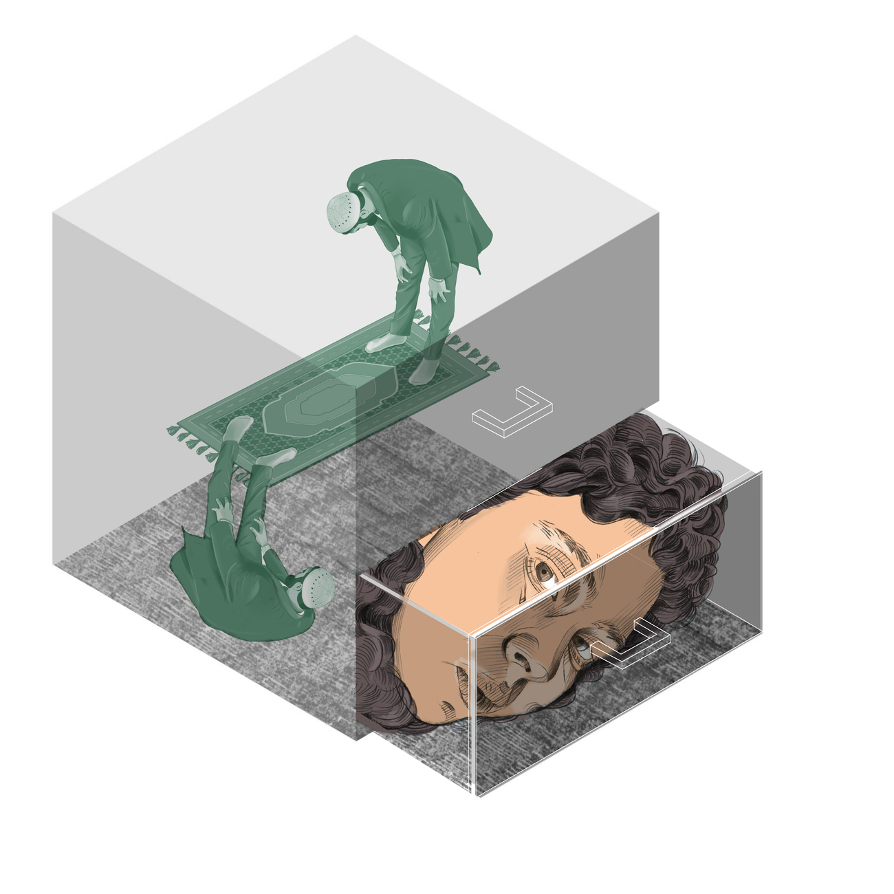 دائمًا ما يُرمى الرجل المسلم في موضع الاتهام. في أحد المعارض التي نظّمتْها مؤسّسةٌ حكوميةٌ معنية بمناهضة العنصرية، طُلب مني تقديم مجموعة من أعمالي. قدّمتُ قائمةً متنوّعةً ضمّت لوحاتٍ لنساء محجّبات ومشاهد من الحياة اليومية، من بينها لوحة لرجلٍ مُسلمٍ يصلّي وهو في وضعية السكون، بهدوء صوفي يخلو من أي تحريض أو مواجهة. لكنّ هذا العمل  كان الوحيد الذي استُبعد، وبلا أي تعليق أو ملاحظة. أما بقية الأعمال، التي تُظهر النساء المحجّبات كضحايا للعنصرية أو العنف، فقبلت دون تردّد. كان ذلك كاشفًا بالنسبة إلي، فالرفض لا يطول المضمون فحسب، بل الرمزية التي يحملها الجسد؛ المرأة المحجّبة الضحية يمكن استيعابها وهي قابلة للعرض. أما الرجل حتى في بعده الروحاني، فهو يُقرَأ كتهديد. صمتُه يُقلق، وحضوره يُزعج. يبدو أن المرأة المسلمة بنظر تلك المؤسسة تُستهلَك كألمٍ، أما الرجل المسلم فلا يُحتمل إلا كغياب.