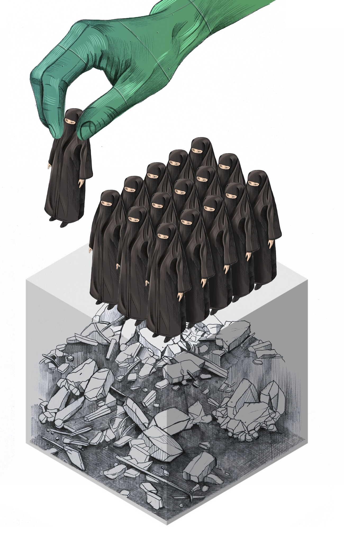 ما هو "الشكل الصحيح" إذًا؟ هو جسد يُقرأ بعدسة الخيال الاستشراقي، يُقاس تحرّره وفقًا لمدى تخلّيه عن خصوصيّته الثقافية أو مدى اقترابه من أن يكون مُتاحًا. التعاطف هنا انتقائيٌّ ومشروط، يُمنح إلى جسدٍ قرّر الآخر أنه "قابل للتحرّر"، بينما ينتزع من جسدٍ يُنظر إليه كـ"مشكلة ثقافية"، أو "أثر ديني"، أو ببساطة "كائن مغلّف". والأخطر من ذلك، هو أن هذه الرمزية البصرية استُخدمت كذريعة سياسية عن طريق دعوات معلنة إلى "تحرير" النساء الإيرانيات عبر فرض العقوبات على البلاد أو حتى شنّ العمليات العسكرية ضدها وقصفها، وكأنما التحرّر مشروع يُنفَّذ من الجو. لم يُسأل حينها إن كانت أولئك النساء يُردن هذا "التحرير"، أو إذا كان طريق العدالة يُفرَش بالدم. على هذا النحو، تتحوّل النسوية البيضاء أحيانًا من دون أن تشعر، إلى أداة عنفٍ ناعمٍ تروّج لبطولةٍ انتقائيةٍ وتصنّف الضحايا وتوزّع التعاطف تبعًا لقابليّة الجسد للتمثيل. في المحصلة لا فرق يُذكر بين صورة تُعرَض على غلاف، وصورة تُنسى في حفرة.